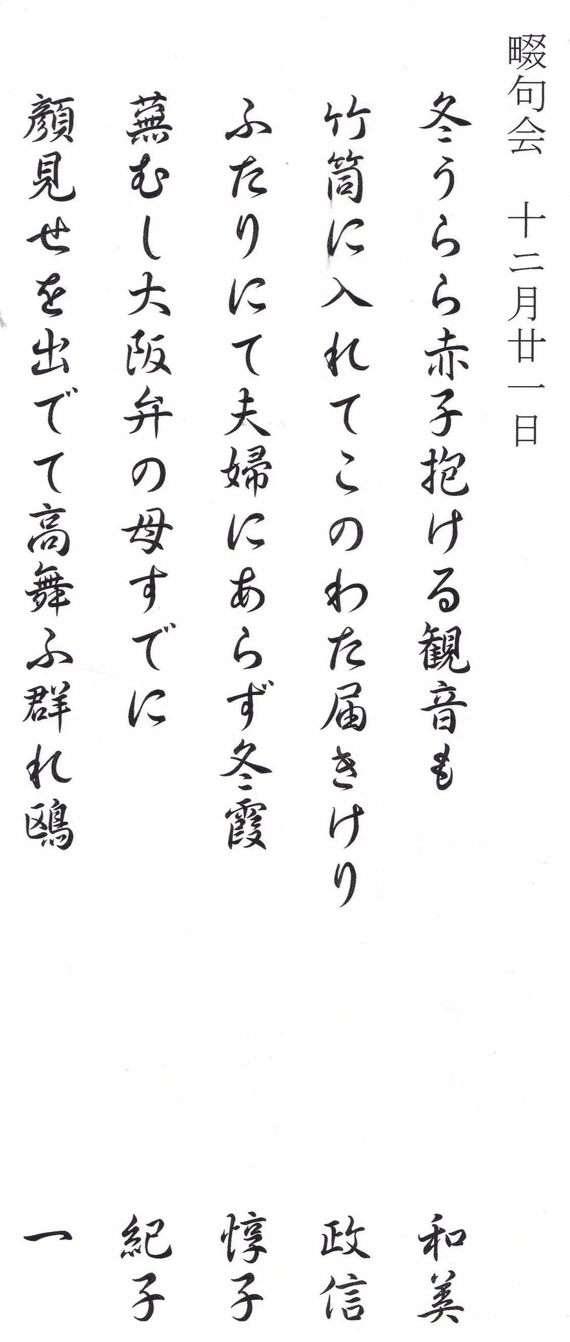 出句 当季雑詠5句 短冊(幅3cm 長さ20cmくらい)に1句ずつ書いて持参